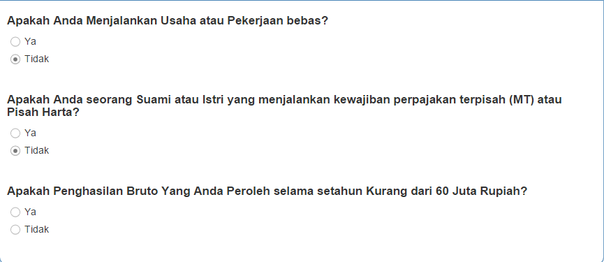 Bila jawabannya tidak, maka akan muncul pertanyaan : Apakah Penghasilan Bruto Yang Anda Peroleh selama setahun Kurang dari 60 Juta Rupiah? .